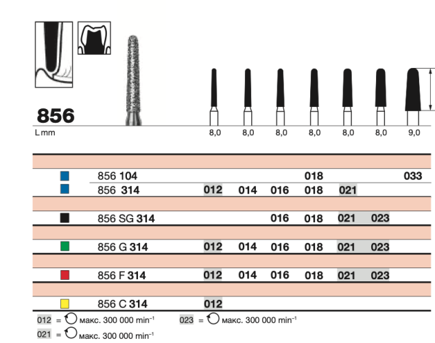 Алмазный бор серии E 856 модели SC 314.016 применяется для профессиональной обработки зубов. Он используется для чистки и формовки полостей и уступов перед проведением реставраций. Его характеристики гарантируют аккуратность и надежность при работе с твердыми тканями.
