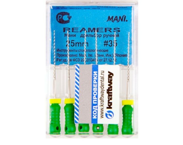 Благодаря длине в 25 мм, Римеры № 35 Mani, могут обрабатывать даже сильно изогнутые каналы. Стальной стержень со спиральной нарезкой снимает тонкие слои дентина и выводит опилки, не причиняя лишнего дискомфорта.
